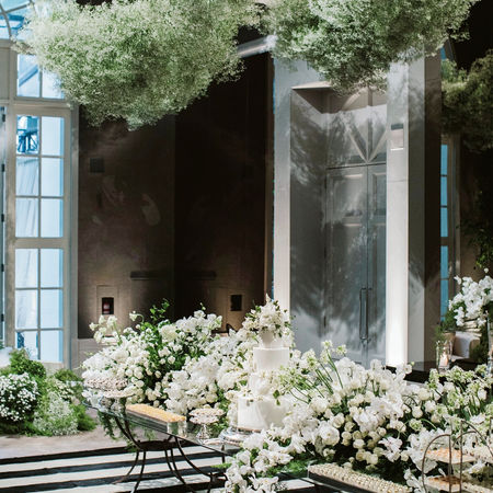 Uma profusão de nuvens de gipsófilas, que significam felicidade, chamavam atenção como o elemento de destaque neste casamento no Palácio Tangará. Criadas por Maria Pietroforte para atender a um pedido do casal, apesar de grandiosas, medindo três metros e meio cada, davam o tom delicado da decoração, imprimindo leveza ao visual. Como o design floral teve a inspiração dos jardins franceses, estavam presentes também ciprestes e formatos arredondadas, além de orquídeas, a flor preferida da noiva, em todos os arranjos.