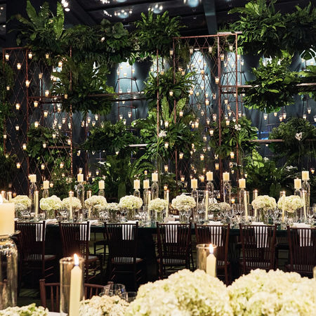 Para produzir esta comemoração mais que especial e repleta de emoção, Valéria Bittar levou 50 dias cuidando da montagem de uma estrutura de 1.600 metros quadrados em sua casa, onde recebeu os 600 convidados do casamento de sua filha. Muito romântica, a noiva desejava um toque mais orgânico na festa, para isso, Valéria aproveitou o pé-direito bastante alto, criando colunas forradas de folhas verdes com flores em branco que destacavam a paleta escolhida. Mais moderno, o mobiliário harmonizava veludos e linhos em tom de verde com laqueados, cadeiras em madeira, muito brilho dos cristais e lustres, além de estantes com folhagens e uma profusão de velas que, aliadas à iluminação na cor âmbar, contribuíam para o clima de romance da ambientação.